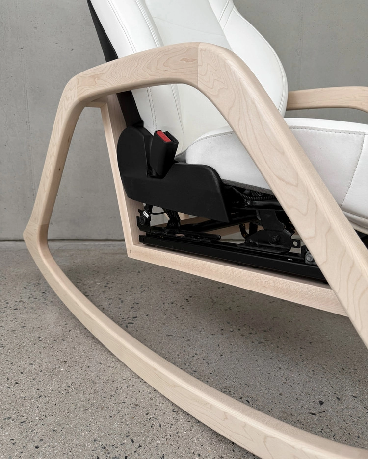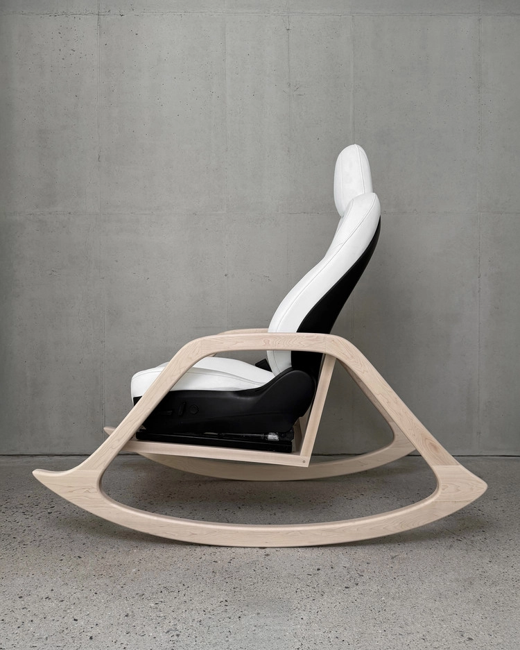 A rocking chair assembled using a Tesla front driver seat.