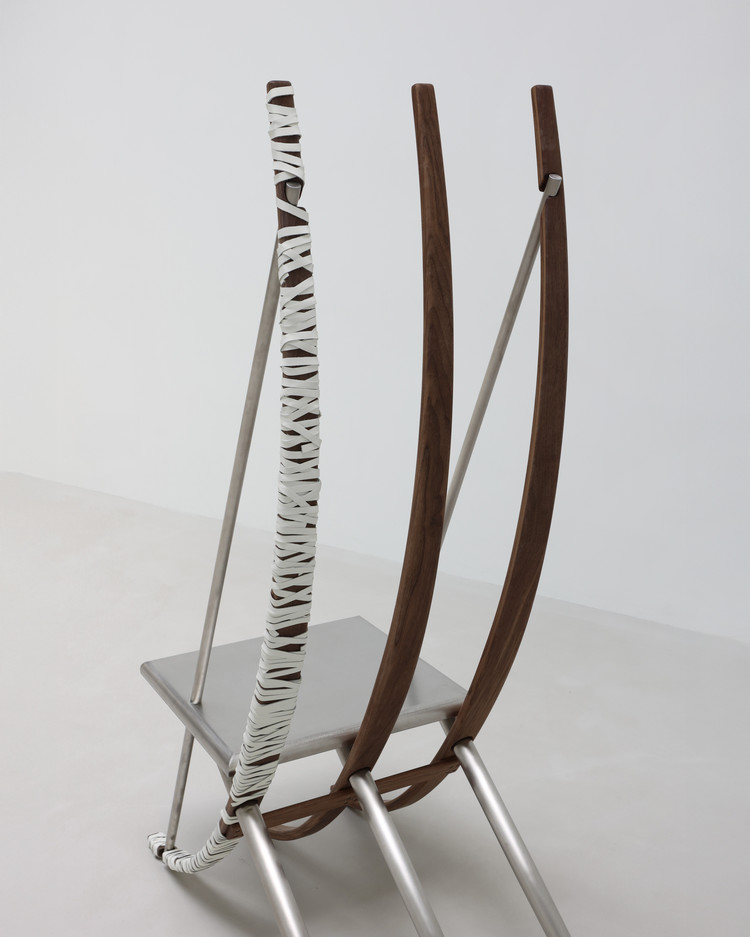 The Bow Chair is constructed from bent walnut forming three curved bow shaped backrests. One of these is wrapped with a white leather strap, while the frame is supported by stainless steel.